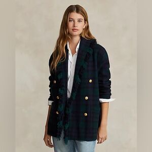 Polo Ralph Lauren Fringed Black Watch Tartan Plaid Double-Breasted Wool Cardigan