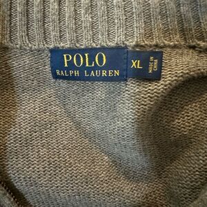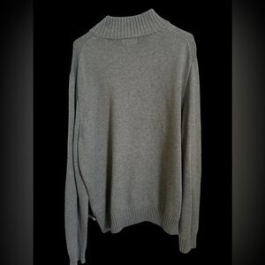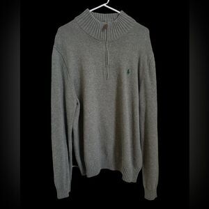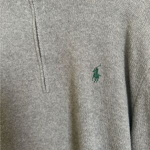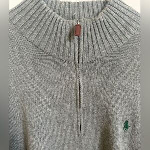 Item Details: Stylish gray sweater with half-zip. Features iconic logo on chest. Comfortable and warm, stretchy.