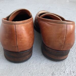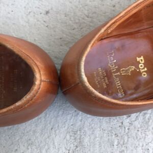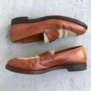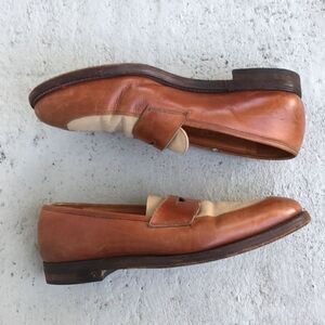 These are beautiful bench made in England leather slip on’s with a canvas top. Canvas needs a little bit of cleaning, back of the heel needs polish. On the inside stitching has a little rip but no big deal. Size 9 1/2.