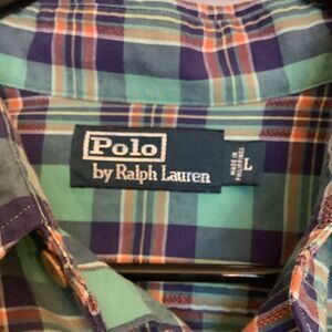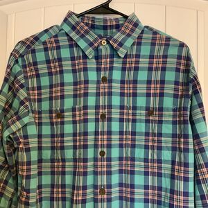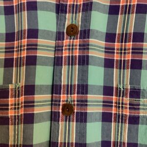 Gorgeous plaid button down in colors of aqua, purple, white and orange plaid. Interesting cross stitching design within plaid pattern. 100% cotton. Nice and soft. Cute wooden buttons. Size large.