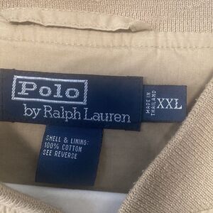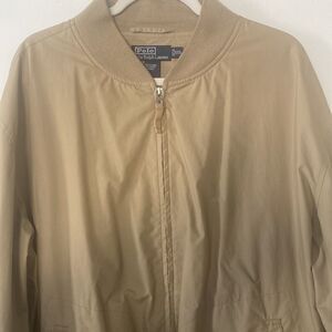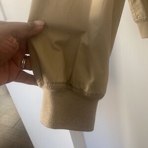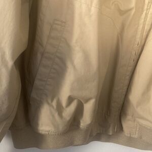 Tan khaki colored jacket with notched collar , zip front and pockets. In EUC