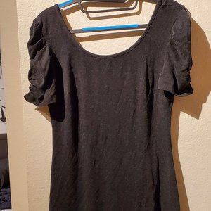Dark gray dress in size 2, short sleeve deep scoop neck. I am very short, 5ft 1in and the dress falls below my knees.