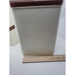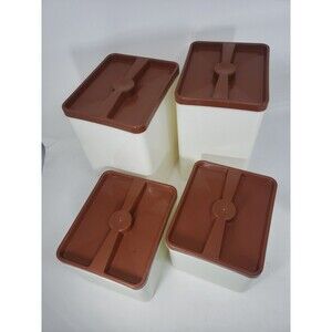 Made of durable plastic, these canisters are in excellent condition and have been well cared for. The design is both functional and stylish, with a vintage feel that will add character to any kitchen. This original set is a great find for collectors and anyone looking for a charming storage solution. Pre-owned. Previously Loved. Good condition. Two Large, Two Smaller canister. 4 Brown Lids. Vintage. MCM. Made in Chicago, USA.