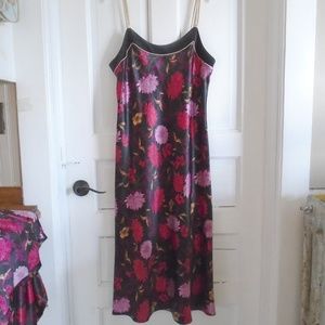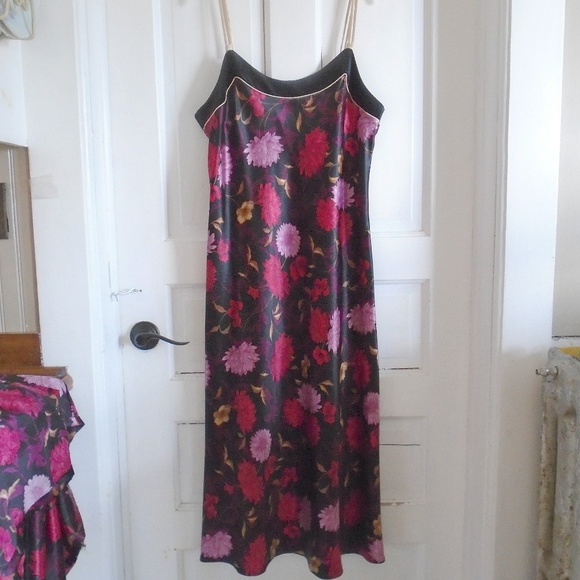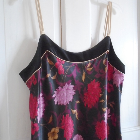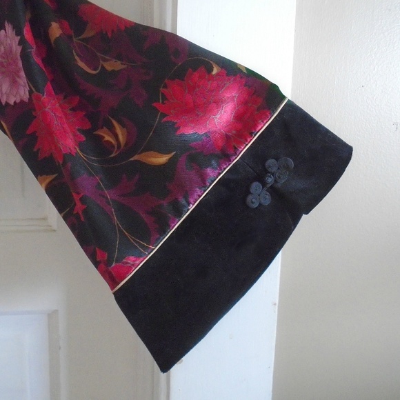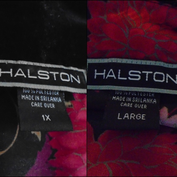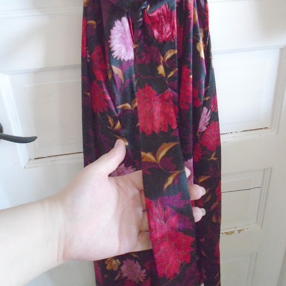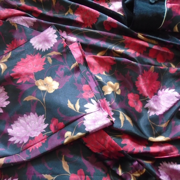 This is a pajama set of a silky, polyester robe and silky, polyester nightgown with black velvet trim. Black with red and purple colored flowers. Nightgown is size Large. Robe is size 1X. Worn once. Pockets in the robe. Halston brand. Pretty embroidery pattern on the sleeves.
