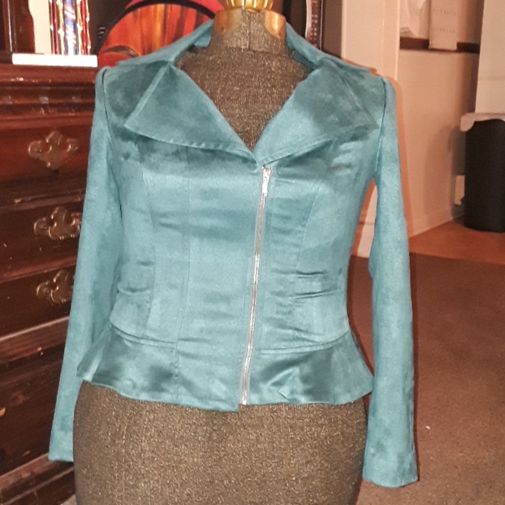 Like new Condition. 97% polyester and 3% spandex material. Lining is black with 95 % polyester and 5% spandex material. Looks like suede. Dry Clean only. Full length sleeves.