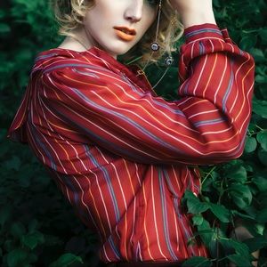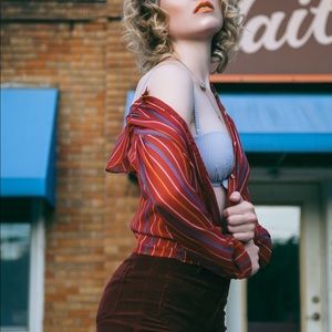 Vintage polyester top, red/burgundy with thin colorful stripes. Some stitching undone from where a belt must have been before, easy to clean up. Very cool funky top, statement piece for sure. I’ve used this in a photoshoot and it hasn’t been used since.