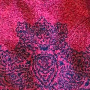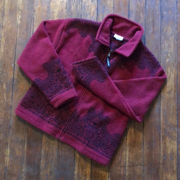 Soft warm and fuzzy! Dark red zip up with collar, pockets, and cinched in the back. Sits at or just below the hips.