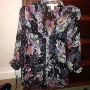 American Rag. Pink and blue flower pattern. Button up. Sheer. XS. Ties in back. Love the ruffles on the bottom!! So flattering!!!