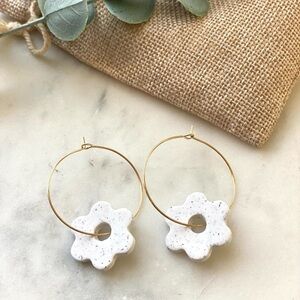 Handmade by me. Speckled white polymer clay flower earrings/gold hoops. Can also take the flower off and wear hoops alone. Lightweight. Perfect for spring and summer months!