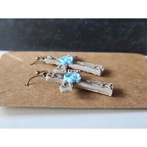 These are a pair of polymer clay blue and brown floral cross shaped dangling pierced earrings new on their original stock card.