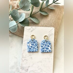 Handmade by me. Polymer Clay earrings with gold post. Blue and white color clay with a stain glass like pattern.