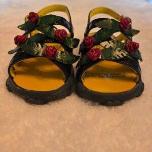Pom D'Api Black Patent Sandals w Red and Green Rose Accents