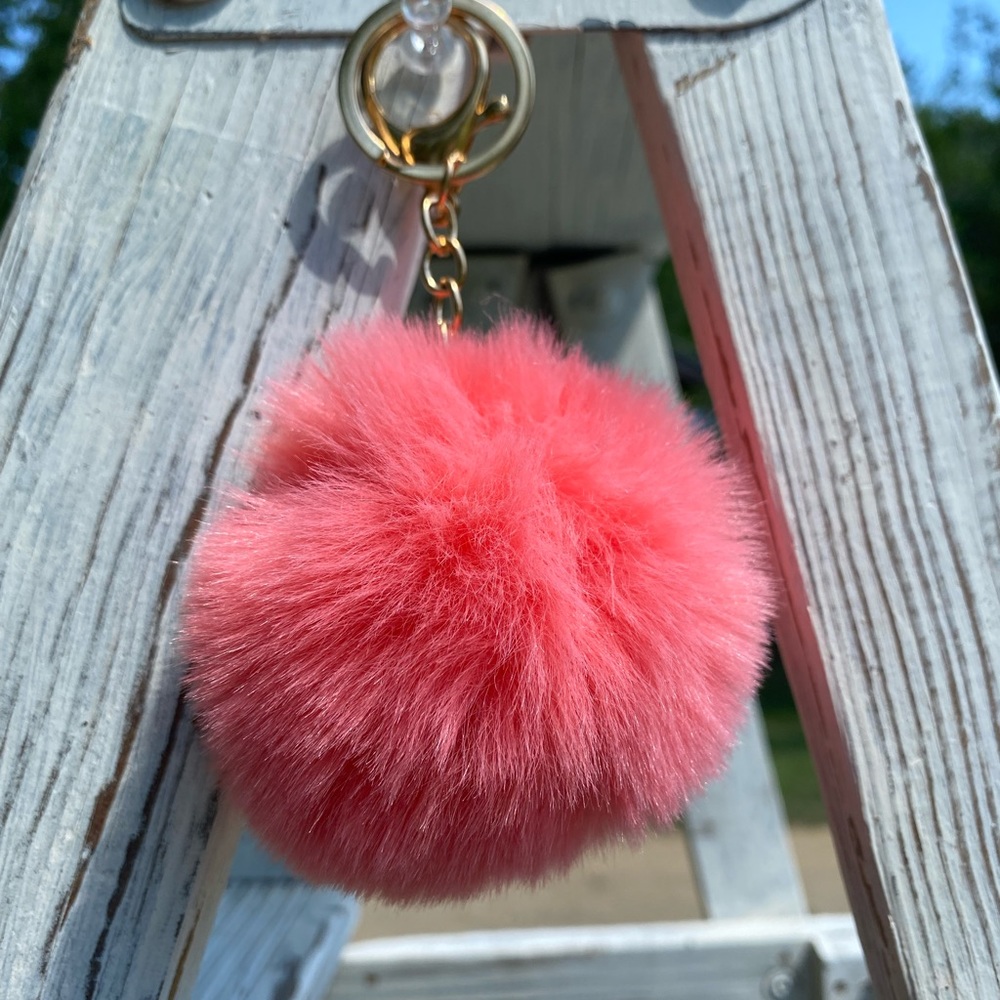 Coral Colored Pom Keychain with gold ring and clasp. Approximately 3”.