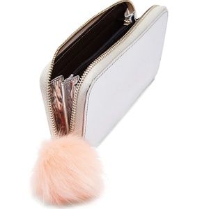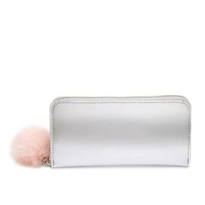 Never used faux patent leather metallic wallet featuring a curb chain and pom pom zipper accent, six card slots, an interior zip pocket, and a zip closure. Approx: Width: 7.5" Height: 3.75" Depth: 1"