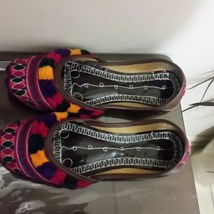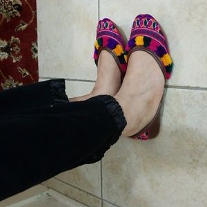 Colorful, pom pom, hand made, pure leather flats, WORN ONCE