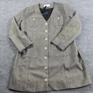 Features a V-neckline with gold decorative buttons down the front