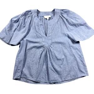 Effortlessly chic and endlessly versatile, the Pomander Place Finley Flutter Sleeve Top is a warm-weather staple in a fresh chambray hue. Designed with a flattering V-neckline, statement flutter sleeves, and a relaxed boxy fit, this blouse is easy to dress up or down—from workdays to brunch with a quick change of accessories.