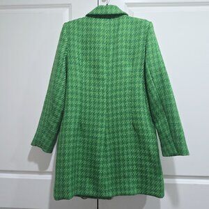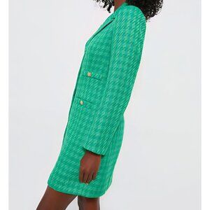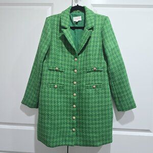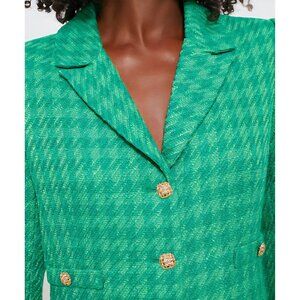 The Emerald Tweed Stacie Dress is party-ready with its vibrant green hue, luxe woven material, and shining gold button details throughout.
