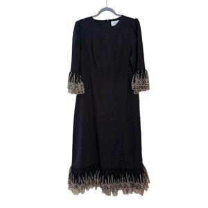 This showstopping black maxi dress features luxe gold embroidered lace at the sleeves and hem, flattering princess seams, a round neckline, and subtle puffed shoulders for a vintage-inspired silhouette. Perfect for weddings, holiday parties, or any formal affair. Hidden zip closure in back. Elegant column fit.