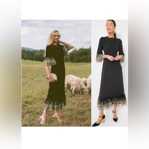 This showstopping black maxi dress features luxe gold embroidered lace at the sleeves and hem, flattering princess seams, a round neckline, and subtle puffed shoulders for a vintage-inspired silhouette. Perfect for weddings, holiday parties, or any formal affair. Hidden zip closure in back. Elegant column fit.