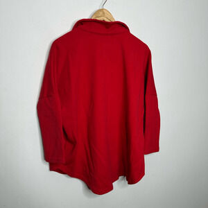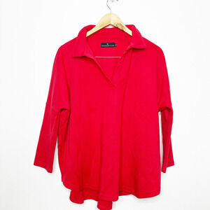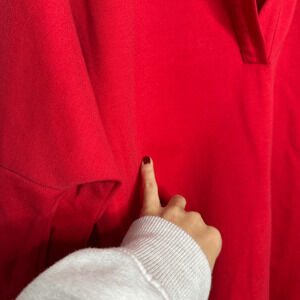 This is the bright red colored, women’s Pomander Place from Tuckernuck Easy Polo Sweatshirt. A super soft and comfortable fabric blend, this oversized and boxy fitting garment had the polo collar neckline and long or 3/4 length arm sleeves. Great medium to heavyweight fabric garment for many different occasions!