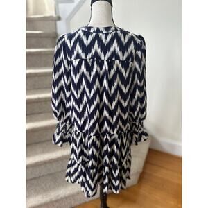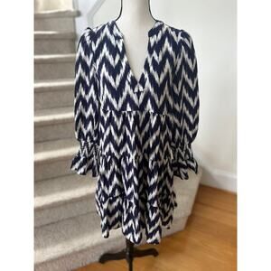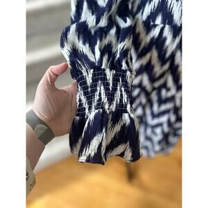Excellent condition. Navy and white Ikat chevron print, blouson sleeves with shirred elastic ruffle cuff sleeves. Long blouson sleeves, tiered skirt, v-neck.