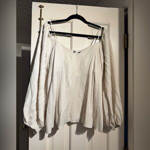 Gorgeous blouse in lightly worn condition! There is a small very light mark on the shirt, please review pictures. Not sure exactly how the brand describes this color - it's an off white, nearly gray beige. Pretty and versatile, light weight, flowy top. Peasant sleeves. Originally $98 - offers welcome