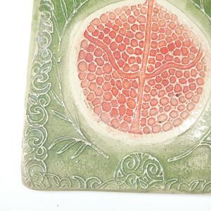 Vintage tile featuring a pomegranate fruit design on green background. Measures about 3.5 inches wide, 4.5 inches tall. Has two holes near the top for hanging. Appears to be signed by the artist -- AR -- on backside. Good shape with no chips or cracks, minor handling wear.
