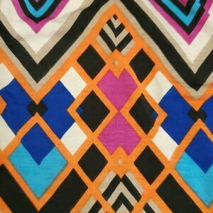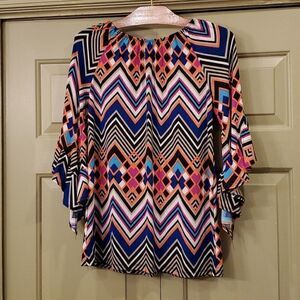 In very good used condition no size tag measures 17 inches armpit to armpit and is about 24 inches long. Fun, funky, and bright geometric pattern. Neckline is elastic with elbow length sleeves that are accented with ruffles. Feel free to ask questions and make offers