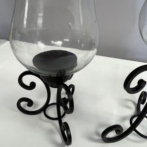 Accessorize your chic space with the Pomeroy Canterbury Pillar Candle Holder - Set of 2. This pair of candle holders starts with a decorative metal base boasting feminine swirl accents. The antique finish adds depth to these candle holders, which arrive in staggered heights. A curved clear glass shade surrounds the candle of your choice. Aprox Measurements: 5.5"L x 5.5"W x 13.3"H