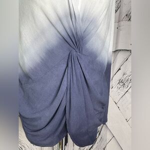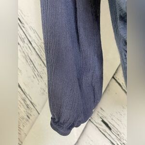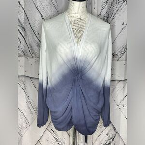 Deep v neck blouse with a twist in the front. Elastic at the wrists.