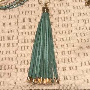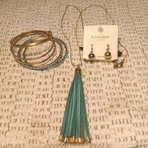 Pomina teal green tassel necklace set with teal blue gold tone bracelet stack - NEW. New on card and new without tag / card.