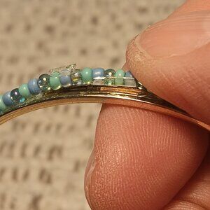 New without tag gold tone & teal blue beads bracelet stack of 5. One small area of beads are loose as glue released - see photo.