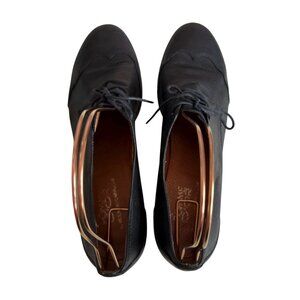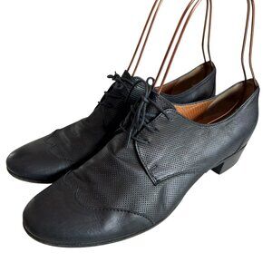 Pomme d'or oxfords, perforated black leather, wingtip toe, lace up, low block heel, leather lining and soles, cushioned insoles, EU 39 / fits like a US women's 8.5 - 9, insole length approx: 10.25", preowned and shows wear on the soles, scuffs, creasing - see photos. They will be carefully wrapped and shipped in a padded envelope