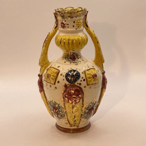 Pompeyi Bejeweled Majolica Ceramic Vase Double Handle Gold Embossed Vintage