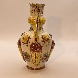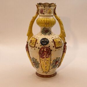 Beautiful Unique Pompeyi Bejeweled Majolica Ceramic Vase with Double Handle and Gold Embossed Design Antique. Great to add to a collection, a unique piece to add to your homes decor, or a great antique gift for a loved one.