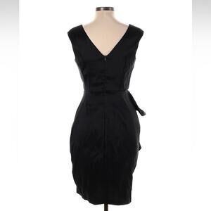 Pompous Studio Petites black sheath dress in a size 12p. Sleeveless, with v neck and veed back, eye-catching draped hip ruffle, and back zip closure. Not much for stretch, and no pockets.
