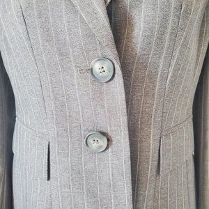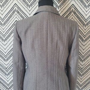 Grey pin striped blazer with 2 button front and fo pocket flaps.