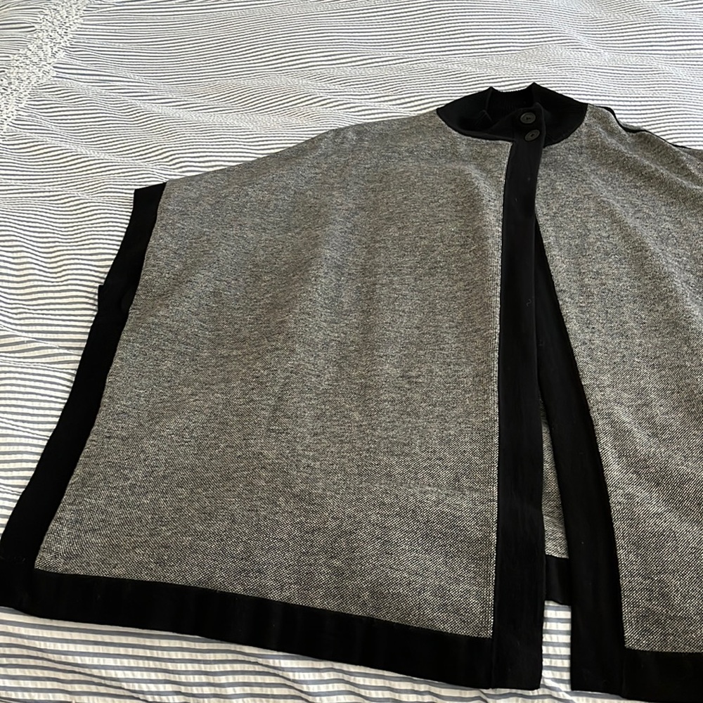 Black and grey poncho w button neck, side tabs and shoulder seams.