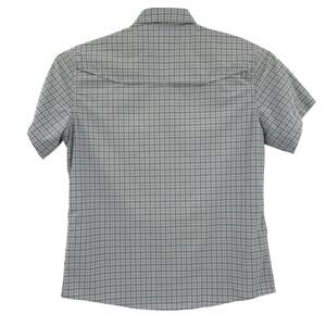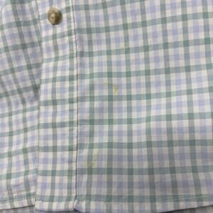 This is a pre owned Poncho Mens XL Slim Fit Blue Green Check Short Sleeve Button Down Shirt. This item is in good condition with the exception of some spots on the bottom. Please see pic.