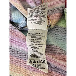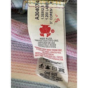 Brightly colored Mexican Serape style poncho in bright rainbow color stripes. Adult one-size unisex. Made in the USA Approximate measurements are: Neck opening 11" Center neck to hem: 30" Side to side width hem to hem 58" ( My model is 12 so the poncho looks a bit large in my photos)