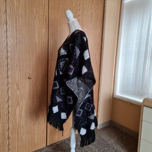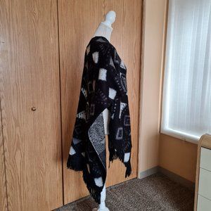 Poncho Shawl Black White Grey Gray Geometric Fringe Tassle Boho Openfront