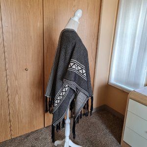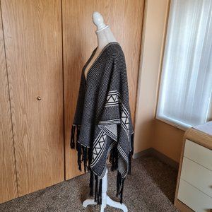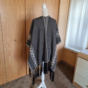 Poncho Shawl Tassels Boho Open Front Knit Wrap Black White Beige Shrug Kimono