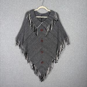 Poncho Sweater Fringe OS Black White Boho Shawl Cape Comfy Cozy Homemade Look Cottage Farmhouse Heritage Country Oversized