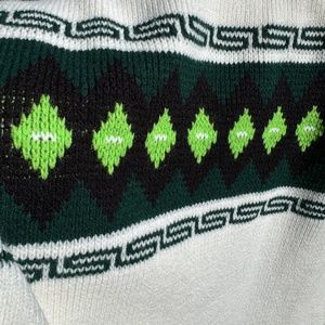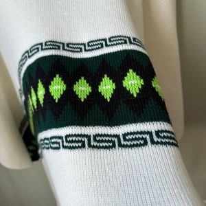 White knit fabric with dark green, neon green and black colors. Mid-heavy weight material that is possibly acrylic.
