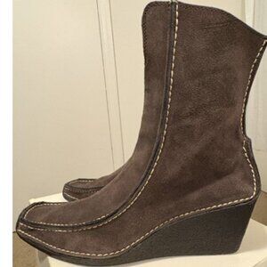 Good used condition NOT in original box. Genuine suede leather upper. 5.5" Shaft, 3" crepe wedge sole and heel.