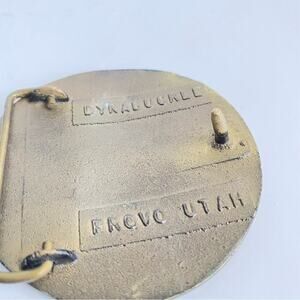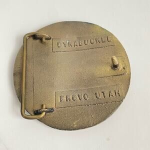 Vintage Round Brass Belt Buckle Ponsness Warren Reloaders Dynabuckle Patriotic Western Mens