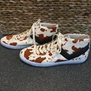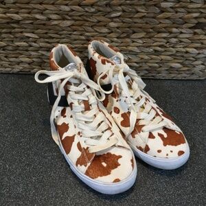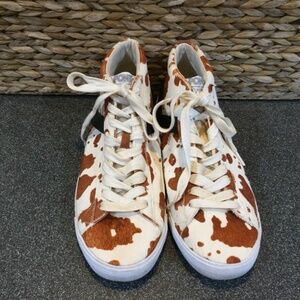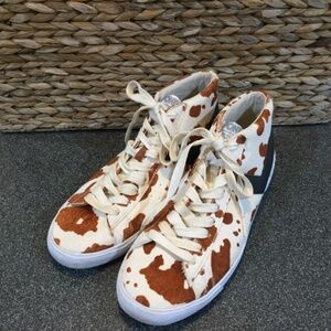 Stylish cow print calf hair lace up high-tops with black chevron detail. Comfortable lace-up design. Perfect for casual wear.