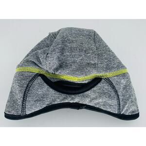 "Reversible ponytail beanie in black, gray, and chartreuse. Made from durable nylon knit fabric, this beanie has a 19.5-inch circumference and limited stretch. Perfect for cooler weather, the design accommodates a ponytail, providing both style and function. Preowned and in good condition, this versatile beanie offers two color options in one, making it a practical and stylish accessory for any casual outfit."