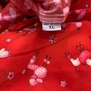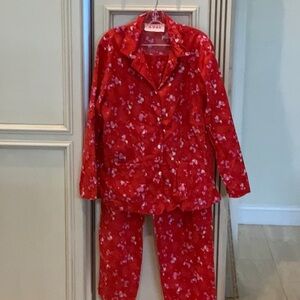 Vibrant red button-up shirt with poodle print pj’s with 2 front pockets. Made in the USA